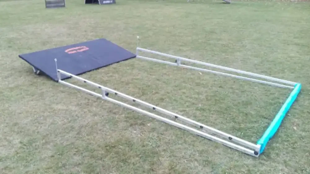 Na końcu ramy znajduje się huśtawka z trwałą plandeką, która sygnalizuje przekroczenie wymaganej odległości skoku – pies ma za zadanie przeskoczyć całą przeszkodę, nie wchodząc w obręb ramy. Regulamin Mondioringu dopuszcza skok od 3 do 4 metrów, dlatego konstrukcja skoku w dal dla psa pozwala na zmianę długości poprzez odpowiednie ustawienie huśtawki.