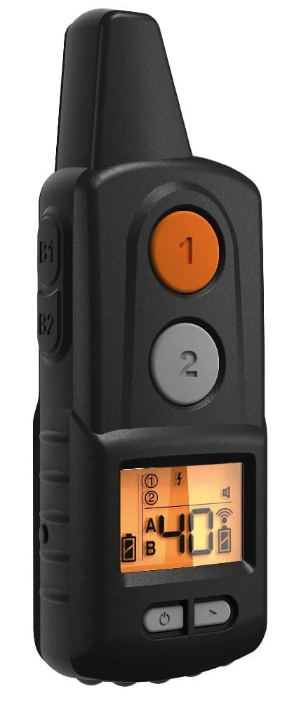 System opiera się na czterech niezależnych przyciskach A1, A2, B1, B2, do których możesz przypisać dowolną funkcję: impuls, wibrację, sygnał dźwiękowy lub światło. Zestaw pozwala pracować zarówno z jednym, jak i z dwoma psami – każdy przycisk może być zaprogramowany oddzielnie.